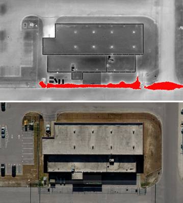 After data is collected, the digital infrared imagery is processed into a series of ortho-rectified image tiles, which are then stitched together to create a giant mosaic image. A computer system puts all this information together using a digital elevation model (DEM) of the scene that consists of a uniform grid of point elevation values and the position and orientation of the camera with respect to a three-dimensional coordinate system output. The result is presented as a high-resolution thermal image in the form of a geo-TIFF (see Figure 5), which is compatible with any GIS software such as ESRI ArcView™, AutoCAD® Map 3D, Global Mapper, MapInfo™, etc. Once high quality digital thermal and photographic ortho-rectified maps are created, they can be added as layers other data sets, to existing or new CAD and GIS systems. Digital data can also be post-processed in other ways, such as creating false color imagery to highlight areas of interest, adding temperature data and/or creating graphic reports (see Figure 6).