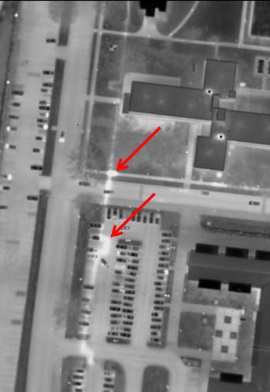 Thermal infrared (IR) imagery is imagery that shows heat. It is often in the form of a grayscale picture whose shades of gray indicate the differences in temperature and emissivity of objects in the image. Typically, objects in the image that look lighter are warmer and those that look darker are cooler. Bright white objects are the warmest in the images. Black objects are the coolest. Any object with a temperature above absolute zero ( 0 Kelvin or –273 degrees Celsius) emits infrared radiation. An infrared picture only shows objects which emit infrared wavelengths in the 3000-5000 nanometer range. Objects in visible light wavelengths of 400 to 700 nanometers are detected, but only because they also emit heat. An example of this would be a warm street light that can be seen in the IR imagery. We record infrared imagery on digital videotape and may later copy it to a VHS videotape and/or a JPEG digital image file. The image may be modified in a number of ways to enhance its value to the end user, such as creating a false-color image or adjusting the brightness and contrast of a grayscale image. The digital images are captured directly to JPEG format and placed on a CD-ROM.